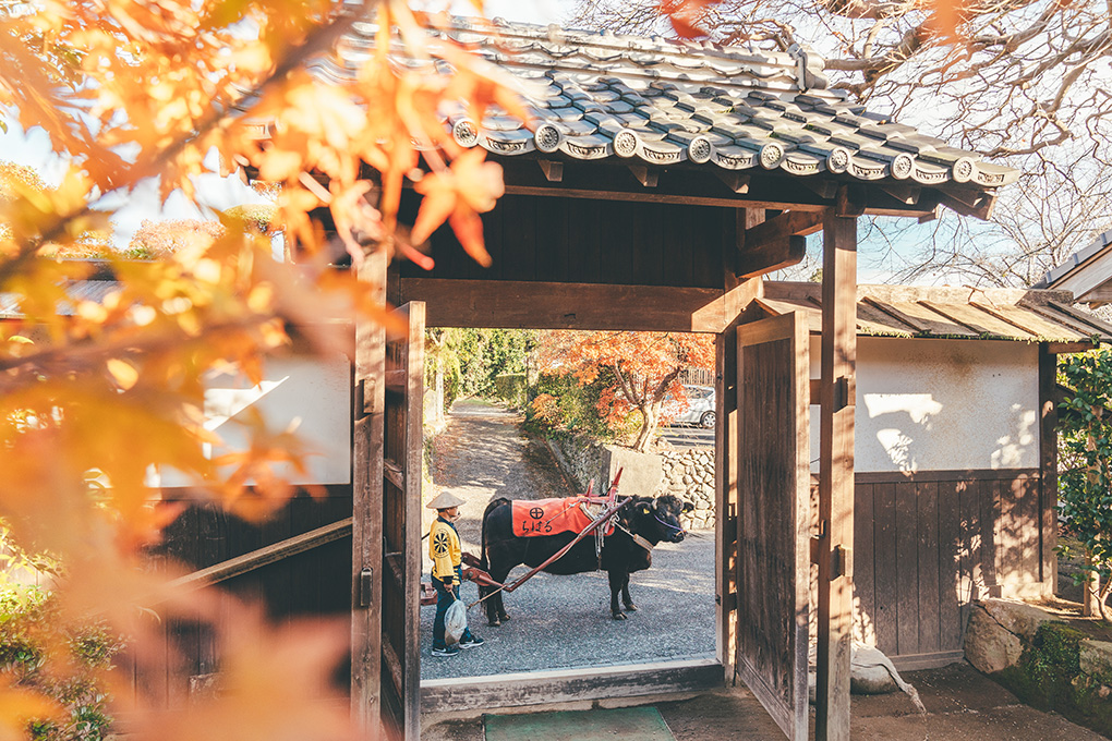 散策は、観光牛車がオススメ。お茶のサービスや陣羽織を着ての記念撮影も。