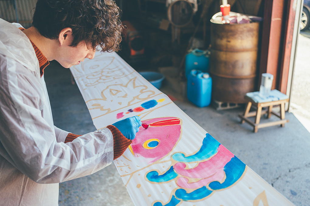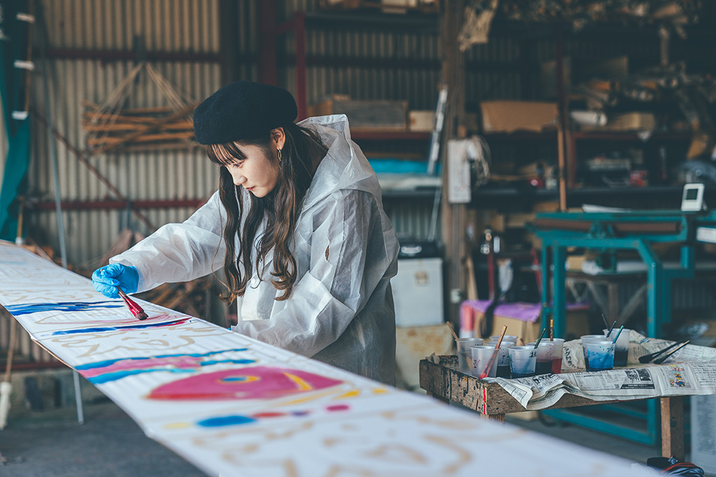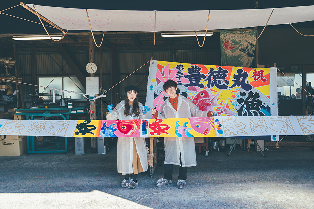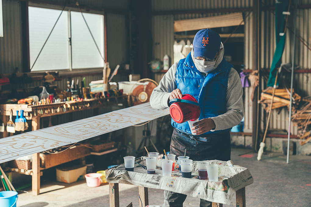 大漁旗などを印染で作製している工房で、手仕事へのこだわりを強く持つ職人の技を学ぶ。